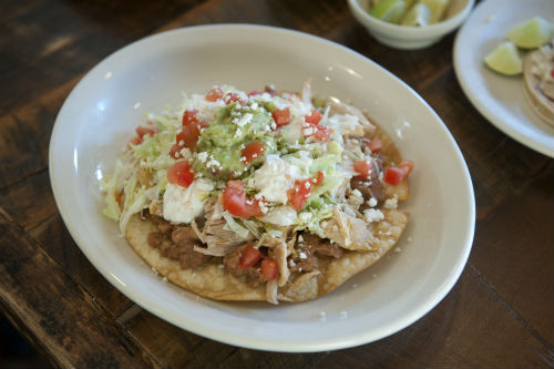 Crisp, flat tortilla covered with beans and topped with shredded lettuce, guacamole, sour cream, tomatoes and queso fresco.