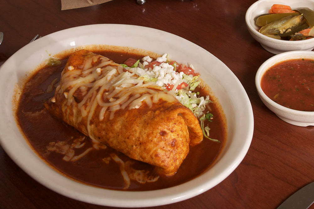 Rolled in a soft flour tortilla served wet enchilada style